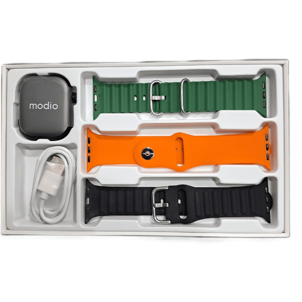 اسمارت واچ سیم کارت خور Modio ST12 از نوع ساعت هوشمند سری 10 است با این تفاوت که در سمت چپ دارای محلی برای قرار گرفتن سیم کارت است. داخل بسته بندی آن 3 عدد بند سیلیکونی کاربردی و شارژر وایرلسی نیز وجود دارد.